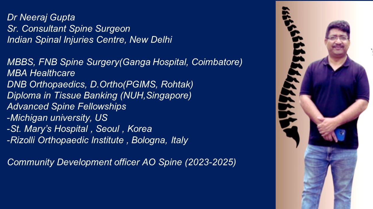 Dr. Neeraj Gupta is a renowned Spine Specialist in Delhi with more than 20 years experience in the field of spinal surgery in Delhi. He is famous nationally as well as internationally for his complex spine surgical work. He is well trained from the best institutes of India and abroad. He got selected for the 2 year FNB Spine Fellowship programme at Ganga Hospital, Coimbatore.